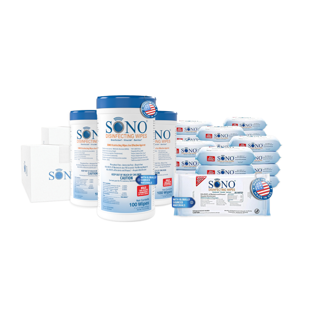 Used for everyday cleaning, SONO Wipes destroy pathogens including SARS-CoV-2, MRSA, HIV, and staph - and inhibit the growth of mold and mildew as well as the odors caused by them. SONO Wipes kill 47 different pathogens with testing done in accordance with EPA performance standards for animal viruses, organisms, trichophyton mentagrophytes, viruses, and bacteria.